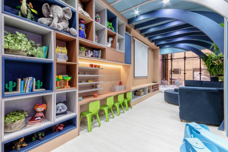 A inovação nas cores é um diferencial neste espaço de 44 m², que opta pela combinação de cinza, azul, terracota e grafite na marcenaria, em vez das cores primárias. Pérgolas em forma de cúpula e almofadas de nuvens criam um refúgio lúdico e criativo, com inspiração no espaço sideral. O ambiente inclui uma oficina de plantas e um aquário, conectando os pequenos à natureza.