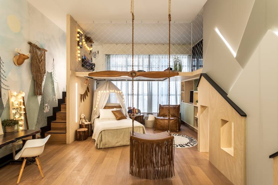 O conceito escandinavo é a inspiração do espaço de 35 m², com móveis de linhas minimalistas e madeiras reaproveitadas empregadas na marcenaria. O grande destaque está na releitura da casa da árvore, no mezanino com rede no piso. Também há uma casa pensada para os pequenos e outra para um cãozinho, além de um balanço. Para completar a experiência lúdica, painel com montanhas.